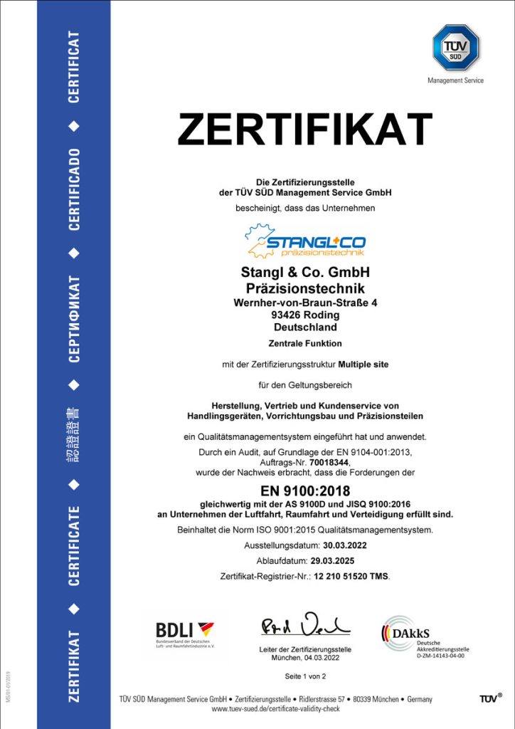 Die SK TECHNOLOGY ist zertifiziert nach DIN EN ISO 9100:2018 (Luft- und Raumfahrtzulassung, Verteidung & Rüstung).